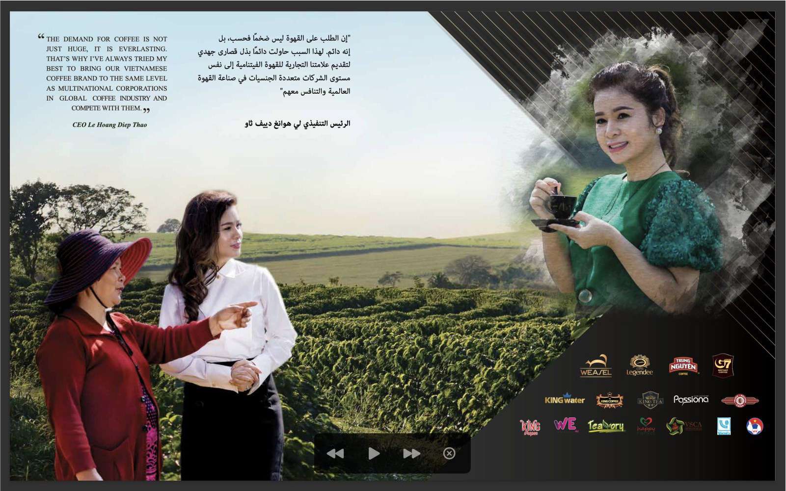 “Động lực không ngừng của tôi là làm thế nào để tôi có thể phát triển ngành cà phê của Việt Nam, giúp nông dân làm giàu và tự hào về thành quả của chính họ. Sản phẩm của chúng tôi được tiêu thụ và yêu thích trên toàn thế giới. Từ đó mới có thể mang lại lợi ích cho quốc gia và cộng đồng ”. Vì Việt Nam là một trong những quốc gia chống dịch tốt nhất trên thế giới, nên dịch bệnh cũng đã giúp King Coffee chủ động tìm kiếm đơn hàng từ các thị trường khác bằng cách phát triển mạng lưới đại lý bán hàng cá nhân trên toàn thế giới. Chỉ trong 12 tháng, thị trường của King Coffee đã tăng gấp đôi số lượng xuất khẩu từ 60 quốc gia lên 120 quốc gia.